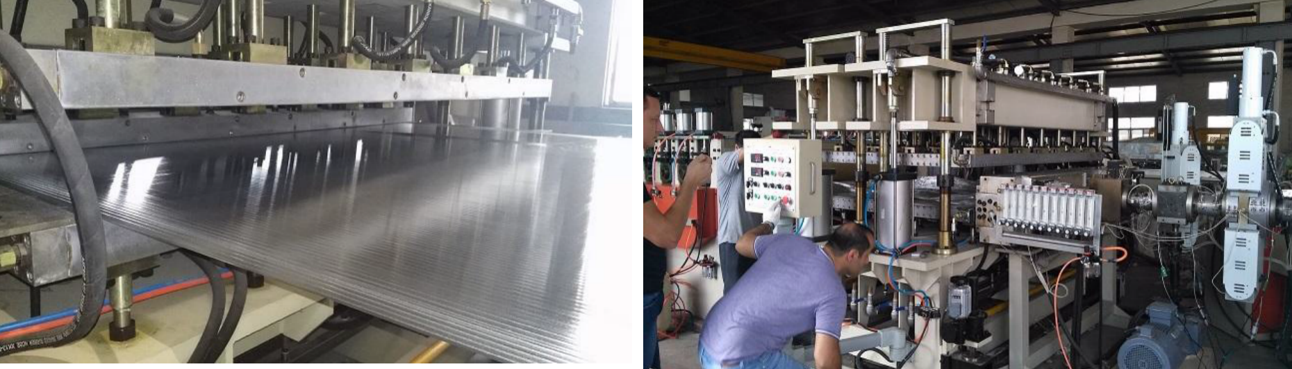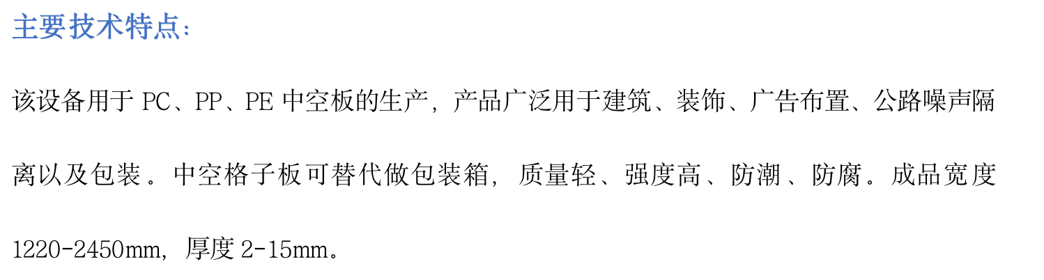 該設(shè)備用于PC、PP、PE中空板的生產(chǎn),產(chǎn)品廣泛用于建筑、裝飾、廣告布置、公路噪聲隔離以及包裝。中空格子板可替代做包裝箱,質(zhì)量輕、強(qiáng)度高、防潮、防腐。成品寬度1220-2450mm,厚度2-15mm。