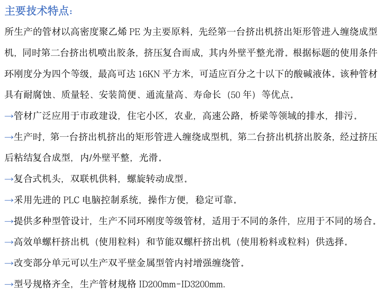 所生產(chǎn)的管材以高密度聚乙烯PE為主要原料,先經(jīng)第一臺擠出機(jī)擠出矩形管進(jìn)入纏繞成型機(jī),同時(shí)第二臺擠出機(jī)噴出膠條,擠壓復(fù)合而成,其內(nèi)外壁平整光滑。根據(jù)標(biāo)題的使用條件環(huán)剛度分為四個(gè)等級,最高可達(dá)16KN平方米,可適應(yīng)百分之十以下的酸堿液體。該種管材具有耐腐蝕、質(zhì)量輕、安裝簡便、通流量高、壽命長(50年)等優(yōu)點(diǎn)。 →管材廣泛應(yīng)用于市政建設(shè),住宅小區(qū),農(nóng)業(yè),高速公路,橋梁等領(lǐng)域的排水,排污。 →生產(chǎn)時(shí),第一臺擠出機(jī)擠出的矩形管進(jìn)入纏繞成型機(jī),第二臺擠出機(jī)擠出膠條,經(jīng)過擠壓后粘結(jié)復(fù)合成型,內(nèi)/外壁平整,光滑。 →復(fù)合式機(jī)頭,雙聯(lián)機(jī)供料,螺旋轉(zhuǎn)動(dòng)成型。 →采用先進(jìn)的PLC電腦控制系統(tǒng),操作方便,穩(wěn)定可靠。 →提供多種型管設(shè)計(jì),生產(chǎn)不同環(huán)剛度等級管材,適用于不同的條件,應(yīng)用于不同的場合。 →高效單螺桿擠出機(jī)(使用粒料)和節(jié)能雙螺桿擠出機(jī)(使用粉料或粒料)供選擇。 →改變部分單元可以生產(chǎn)雙平壁金屬型管內(nèi)襯增強(qiáng)纏繞管。 →型號規(guī)格齊全,生產(chǎn)管材規(guī)格ID200mm-ID3200mm.