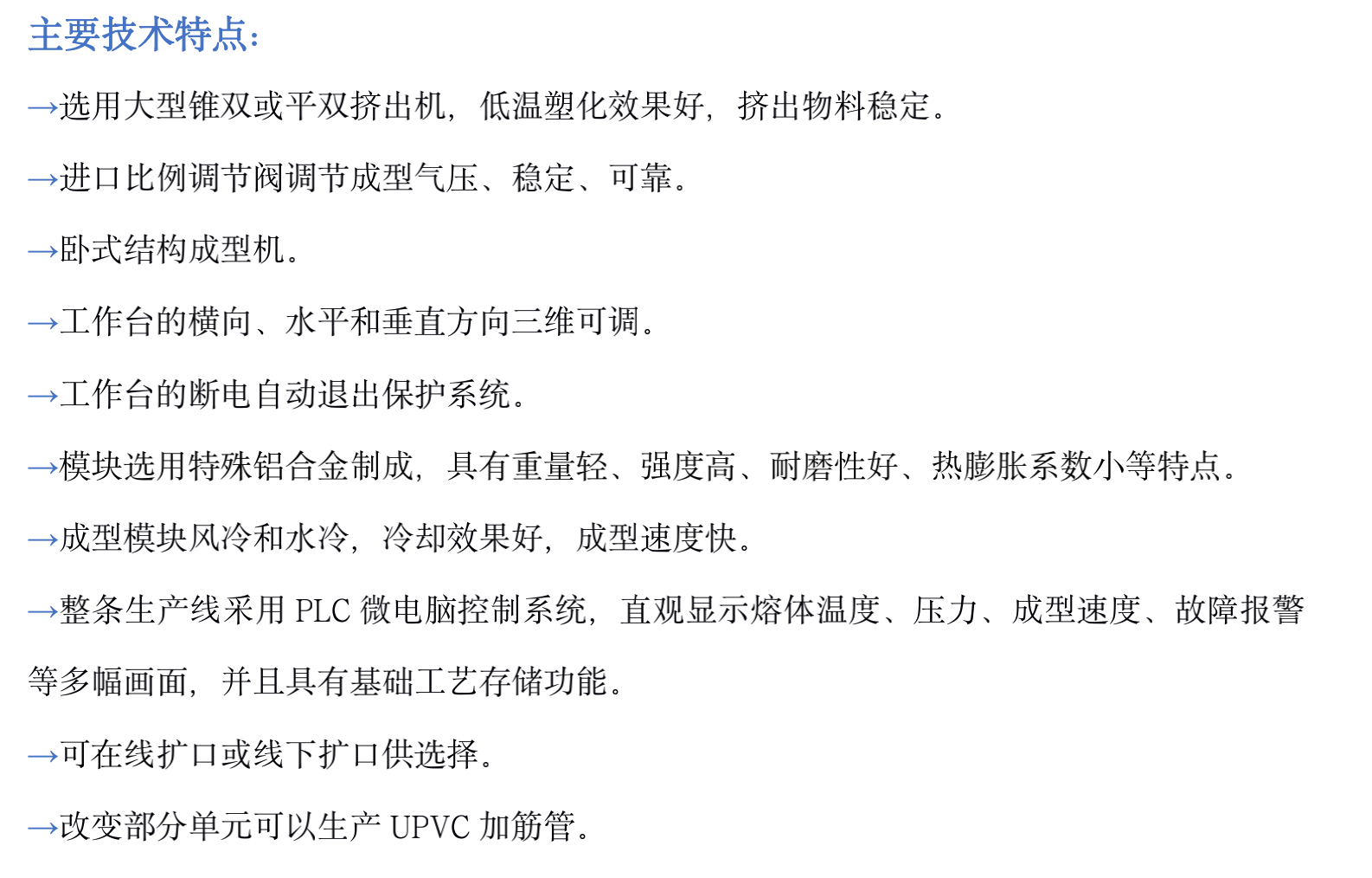 →選用大型錐雙或平雙擠出機,低溫塑化效果好,擠出物料穩(wěn)定。 →進口比例調(diào)節(jié)閥調(diào)節(jié)成型氣壓、穩(wěn)定、可靠。 →臥式結(jié)構(gòu)成型機。 →工作臺的橫向、水平和垂直方向三維可調(diào)。 →工作臺的斷電自動退出保護系統(tǒng)。 →模塊選用特殊鋁合金制成,具有重量輕、強度高、耐磨性好、熱膨脹系數(shù)小等特點。 →成型模塊風(fēng)冷和水冷,冷卻效果好,成型速度快。 →整條生產(chǎn)線采用PLC微電腦控制系統(tǒng),直觀顯示熔體溫度、壓力、成型速度、故障報警等多幅畫面,并且具有基礎(chǔ)工藝存儲功能。 →可在線擴口或線下擴口供選擇。 →改變部分單元可以生產(chǎn)UPVC加筋管。